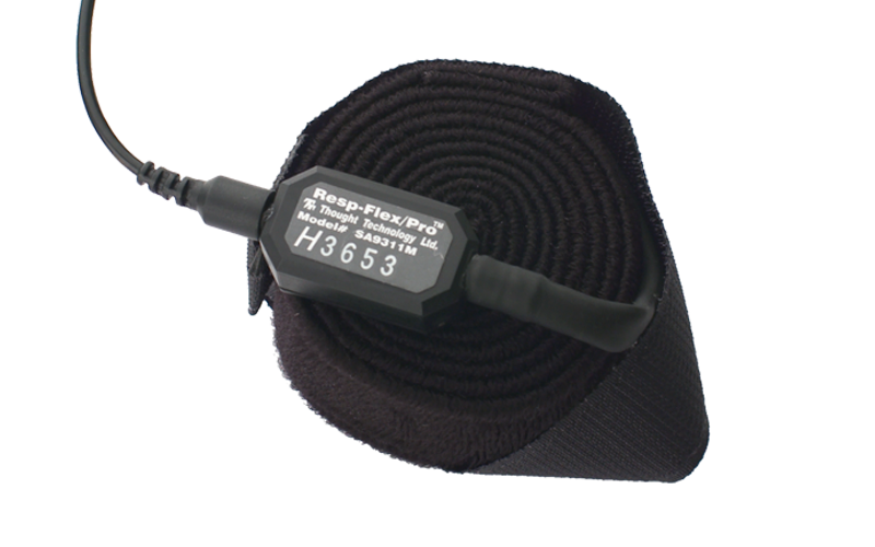 The Respiration Sensor is a sensitive girth sensor using an easy fitting high durability latex rubber band fixed with self-adhering belt. It detects chest or abdominal expansion/contraction and shows the respiration waveform and amplitude. It can be worn over clothing.