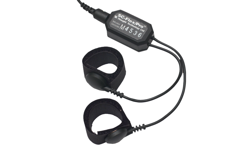 The Skin Conductance Sensor measures electrical conductance between two points on the skin, and is normally connected to the fingers or toes. It is supplied with two finger bands.