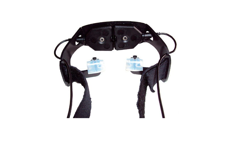 pIR HEadGear™: The headgear is made of thin, lightweight plastic and holds two adjacent pIR sensors in the configuration shown to the right (see rear view).